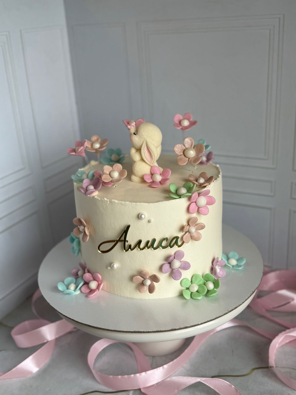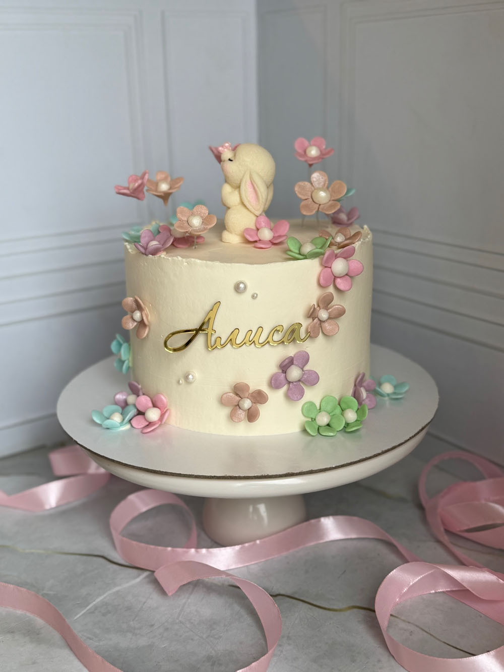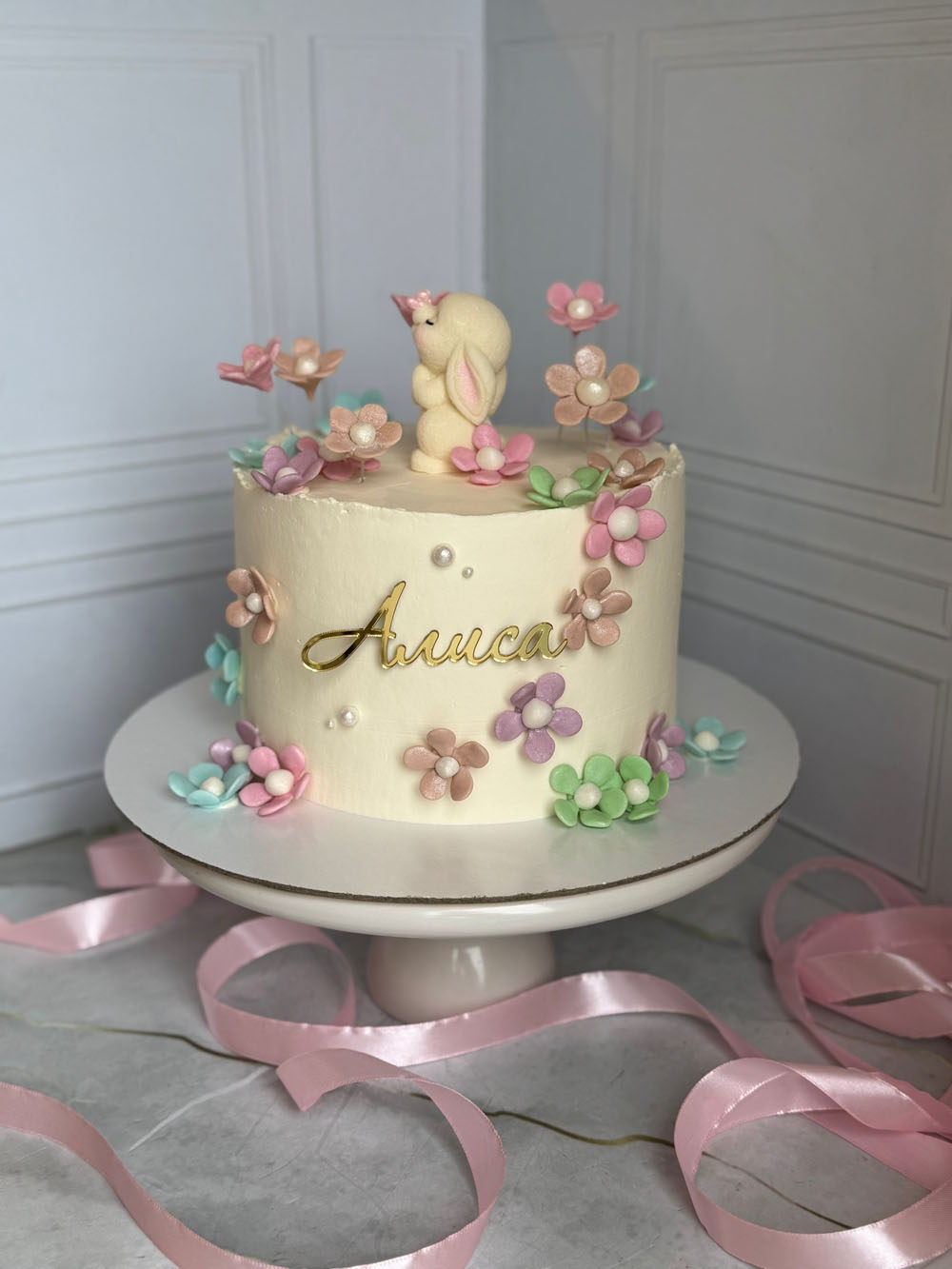 Декор: шоколадная фигурка, цветочки -мастика, акриловый топпер.