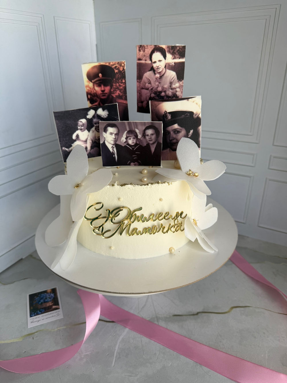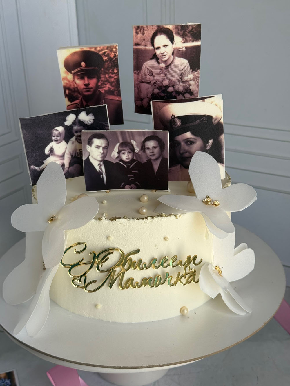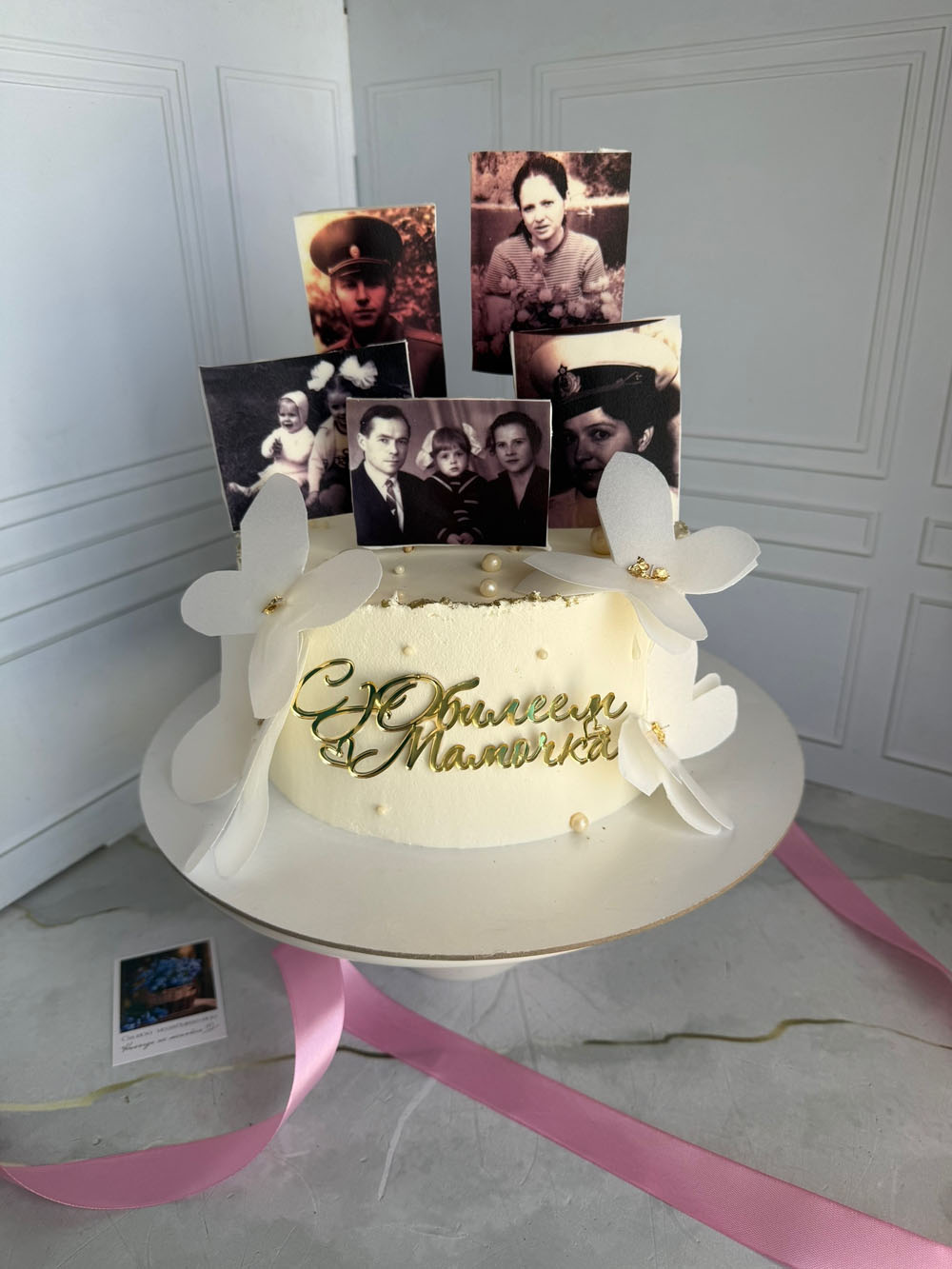Торт на юбилей для мамы. Начинка фисташка-малина. Фисташковый бисквит, крем на основе сыра маскарпоне, творожного сыра и фисташковый пасты, малиновое конфи. Декор фото — сахарная печать, акриловый топпер и бабочки вафельная бумага.
