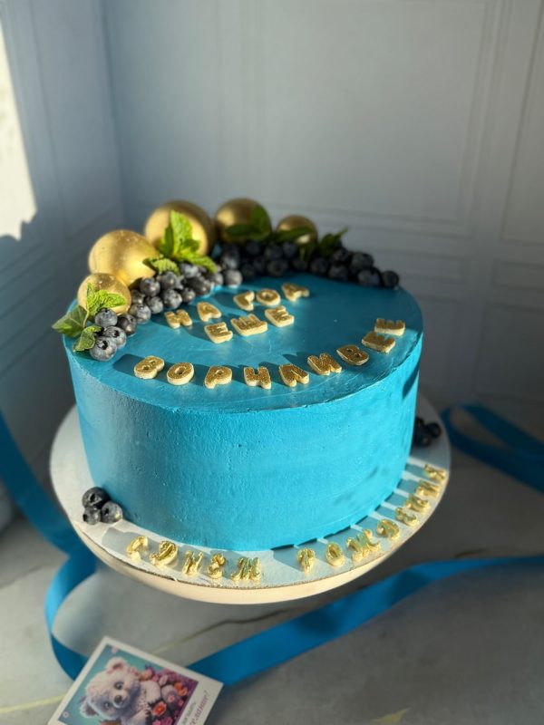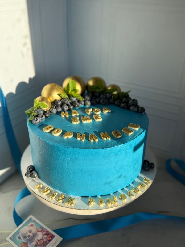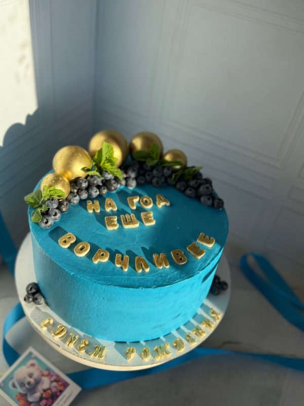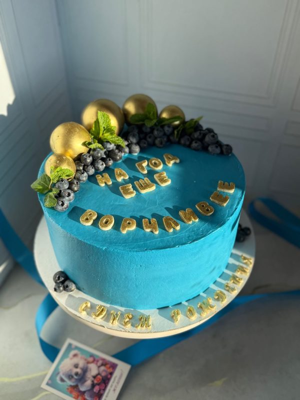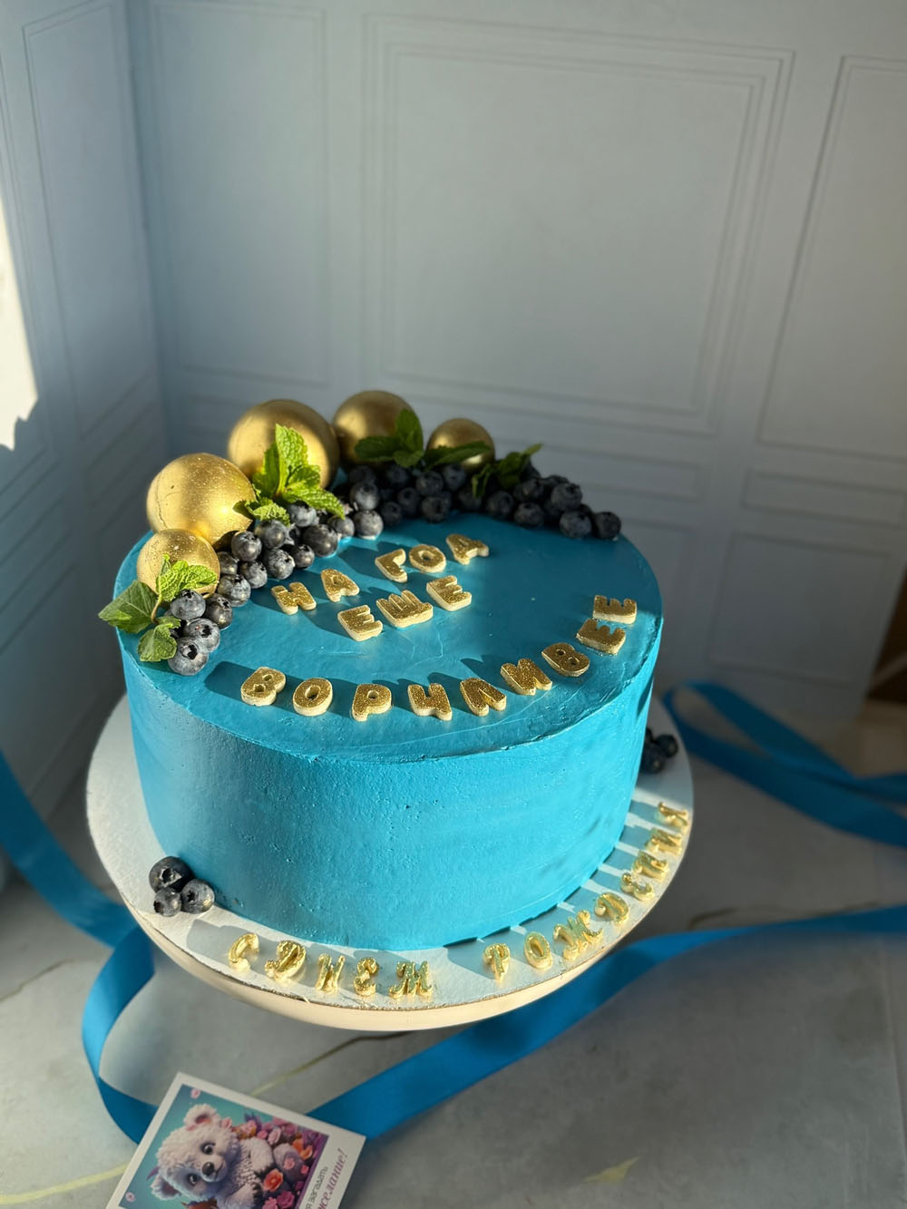 Декор: Шокадные сферы, текст и ягоды голубики.
