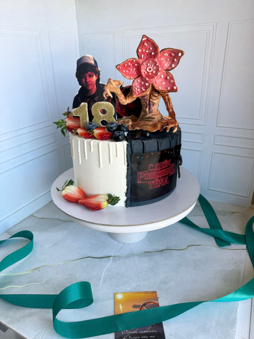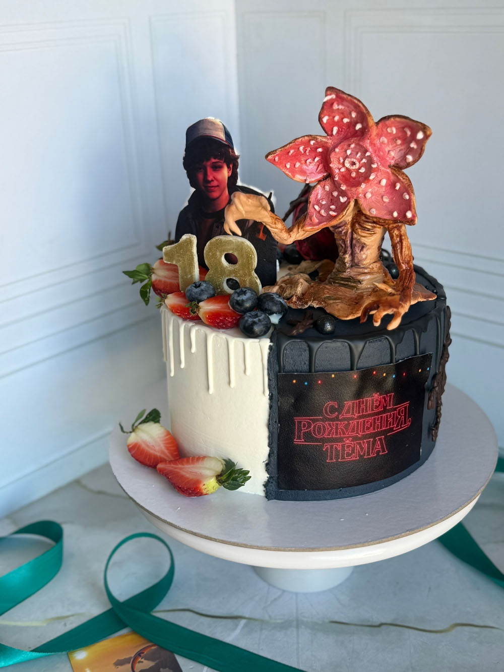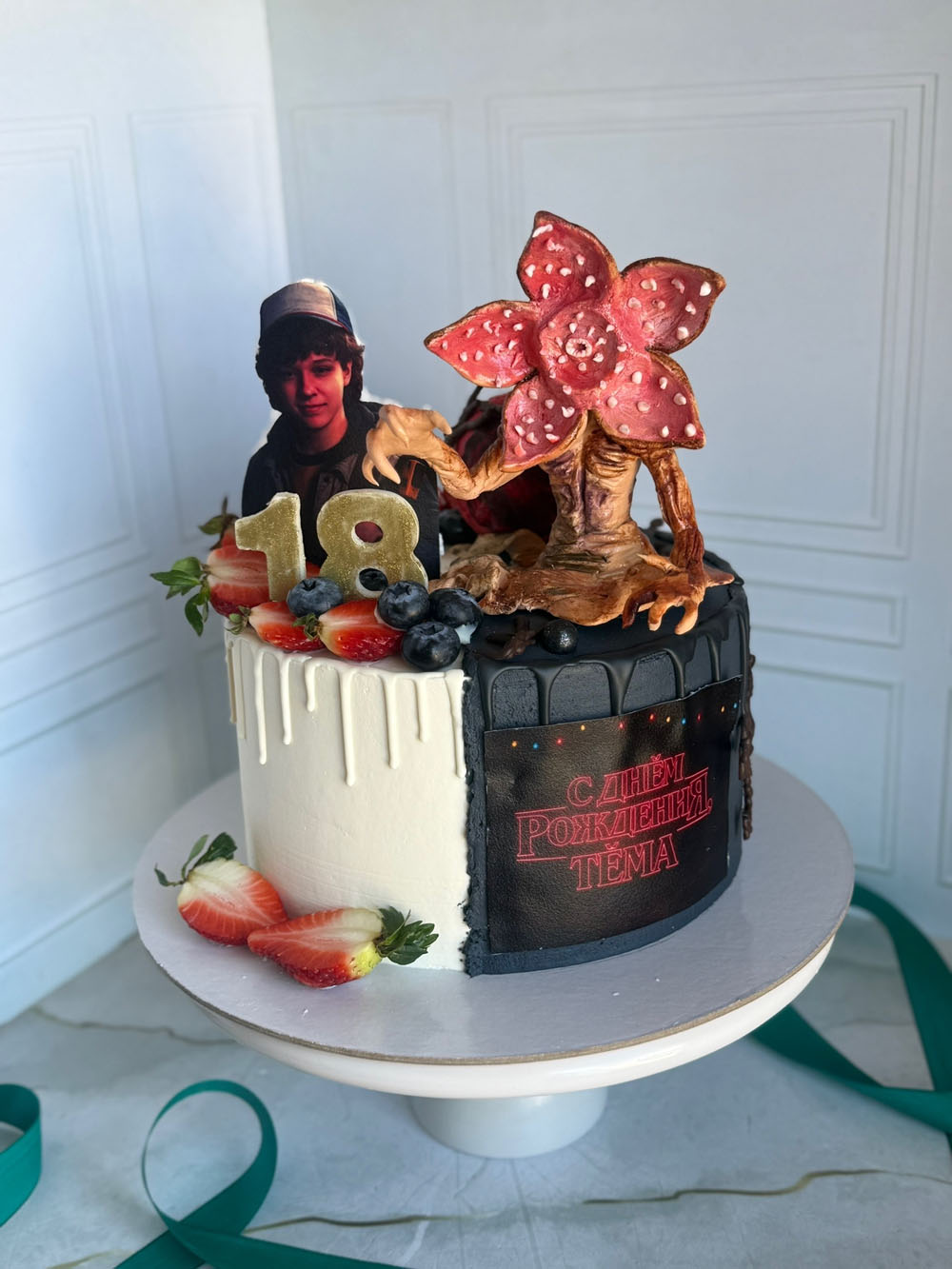 Декор: сахарная печать, мастичная фигурка, свежие ягоды.