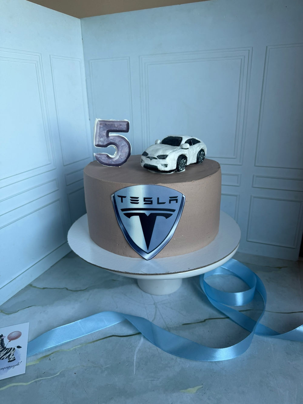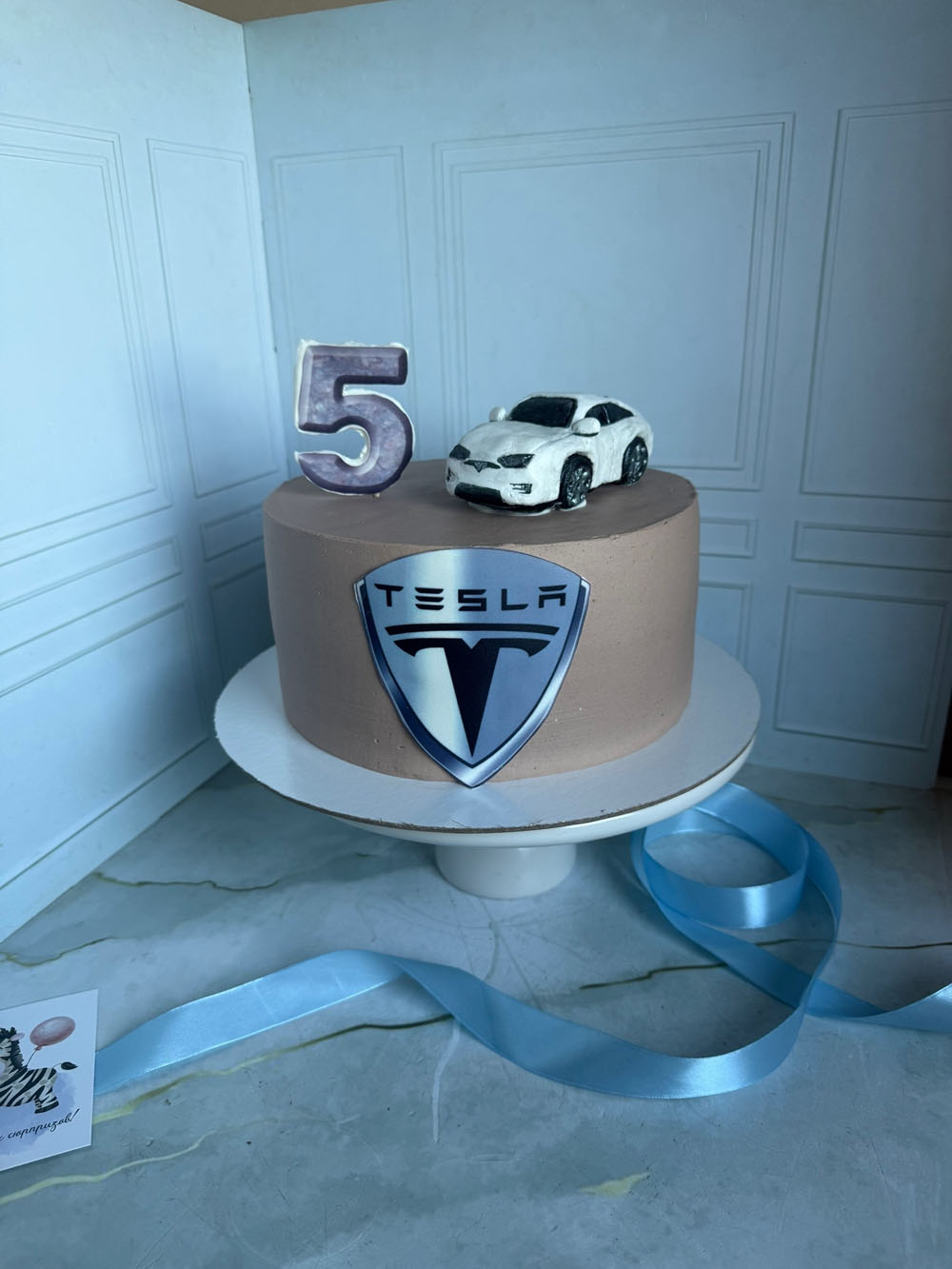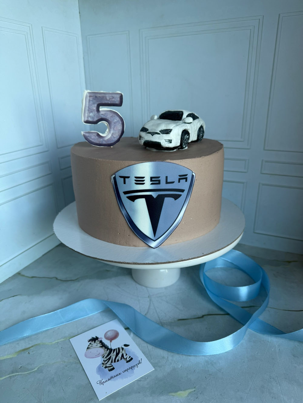 Торт для мальчика на 5 лет с машиной. Внутри начинка «Сникерс». Нежный шоколадный бисквит, мусс на молочном бельгийском шоколаде, карамель, дробленный фундук, крем чиз.